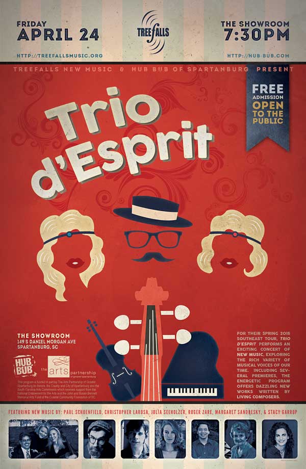 In the fall of 2014, Treefalls held an open Call for Scores, inviting young composers from all over the world to submit their work. Music poured in from over 27 different countries, all from aspiring artists under the age of 38 hoping for a performance by Trio d’Esprit. After careful consideration, several rounds of judging, and a practiced reading session, three brand-new works were chosen to be a part of the Trio’s spring tour!