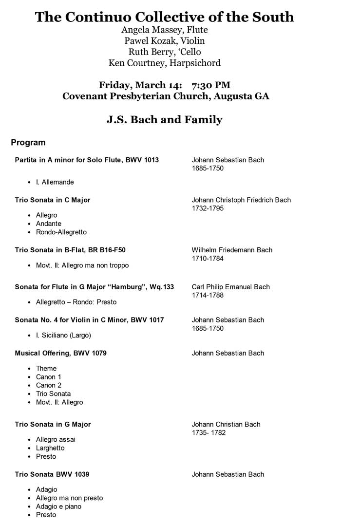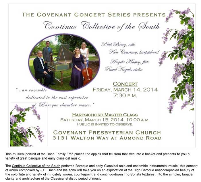 The Continuo Collective of the South is an ensemble dedicated to the vast repertoire of Baroque chamber music. The "continuo," the harpsichord and ‘cello, is the consistent, driving force of the group as they cover all of the harmonies and reinforce the "voice" most fundamental to baroque accompaniment: the bass line. This core duo is always included in the Continuo Collective’s concerts and joined by a variety of instrumentalists or vocalists depending upon the repertoire being performed.